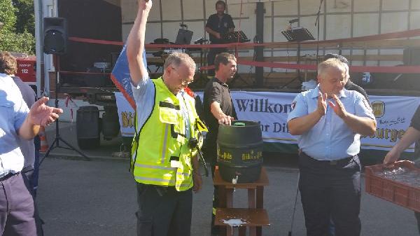 Als die Übung beendet war, ging es unter Begleitung des Spielmannszuges der FFW Wellesweiler zurück zum Gerätehaus. Hier traten die Kameradinnen und Kameraden der Jugendfeuerwehr zur Meldung an die Bürgermeisterin an. Nach diversen Grußworten war es dann an unserem Jugendbetreuer Guido Kuhn den Fassanstich durchzuführen. Nach 3 beherzten Schlägen lief schließlich das Bier und die Tage der offenen Tür in Dirmingen konnten starten.