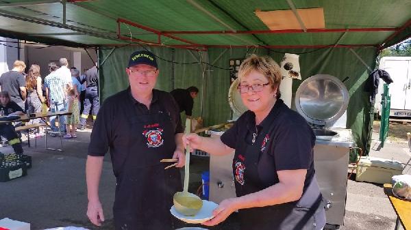 Es wurde bis tief in die Nacht gefeiert, getrunken und gelacht. Der Sonntag begann früh, um 6:00 Uhr hieß es "Feuer an" in der Feldküche, denn es galt die allseits beliebte Erbsensuppe zu kochen. Rund um den Festplatz wurde alles in Ordnung gebracht, dass um 10:00 Uhr der Frühschoppen beginnen konnte, welcher ebenfalls durch den Spielmannszug der FFW Wellesweiler musikalisch begleitet wurde.