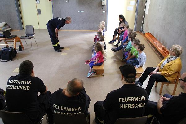 Löschbezirksführer Bruno Paul und seine Helfer erklärten den Kindergartenkindern kindgerecht, was sie tun müssen, wenn sie ein Feuer entdecken: Zum Beispiel einen Erwachsenen zu rufen oder auch schon selbst den Notruf zu wählen. Mit den Erzieherinnen wurde besprochen, welche Notausgänge zur Verfügung stehen und wo sich die Sammelplätze befinden.