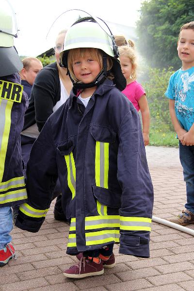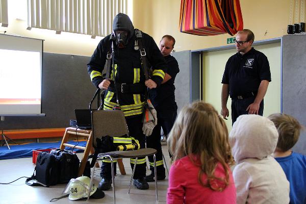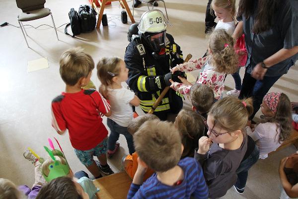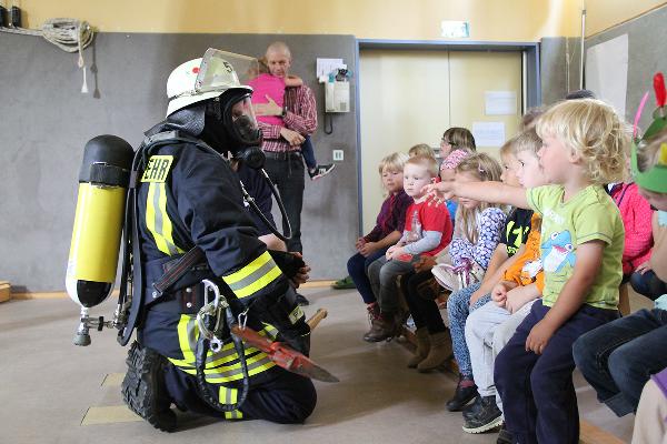 Wenn die Feuerwehr zu einem Brandalarm anrückt, rüsten sich die Feuerwehrleute mit Atemschutzgeräten und vielen Hilfsmitteln wie Axt oder Lampe aus. Um den Kindern die Angst vor den dermaßen "verkleideten" Rettern zu nehmen, durften die Kleinen einen voll ausgerüsteten Feuerwehrmann auch einmal aus der Nähe bestaunen und anfassen.