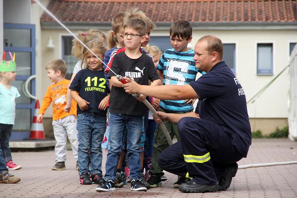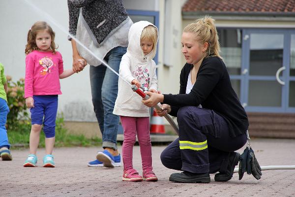 Bei der anschließenden Räumungsübung konnten Erzieher und Kinder dann beweisen, dass sie im Ernstfall einen kühlen Kopf bewahren und das Gebäude schnell und sicher verlassen können. Und damit es nicht bei der trockenen Theorie blieb, durften die Kinder schließlich auch selbst einmal mit dem großen Wasserschlauch spritzen.