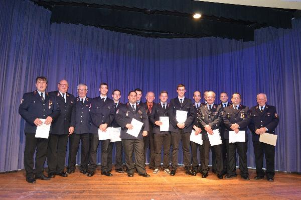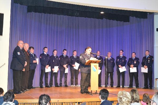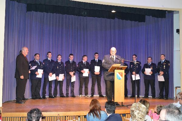 Im Anschluss beförderte Werner Michel zusammen mit Klaus Theis, die Kameraden Tim Jochum, Patrick Hell, Florian Bonner, Timo Wohlgemuth, Dennis König und Kevin Kunz zu Feuerwehrmännern. Manuel Braun wurde zum Oberlöschmeister ernannt. Der stellvertretende Löschbezirksführer Frank Bonner erhielt die Ernennung zum Brandmeister. Löschbezirksführer Andreas Groß erhielt die Urkunde zum Oberbrandmeister. Der stellvertretende Wehrführer Wolfgang Braun trägt ab jetzt den Dienstgrad eines Hauptbrandmeisters.