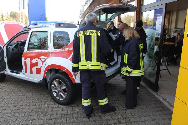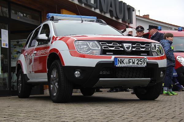 Im Mittelpunkt des Interesses stand aber sicherlich das neuen Kommandofahrzeug für Wehrführer Klaus Theis. Mit dem Dacia Duster in auffälliger Feuerwehrlackierung wurde robustes, schnelles und geländegängiges Fahrzeug geleast, das allen Anforderungen der Wehrführung gerecht wird.