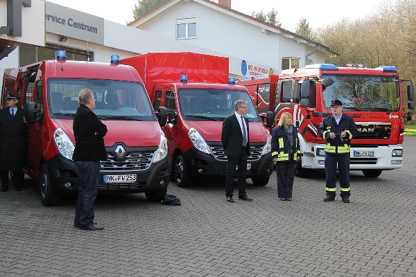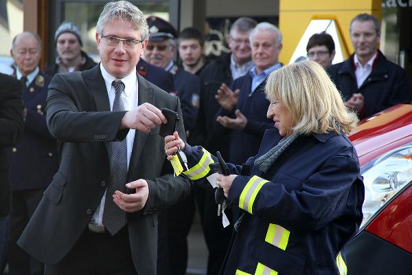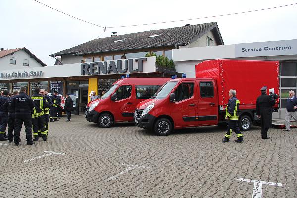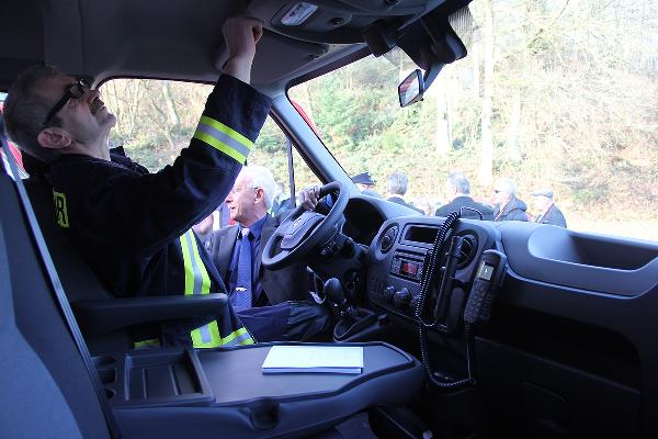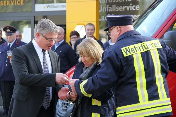 Mit rund einer Stunde Verspätung konnte die Fahrzeugübergabe dann doch noch stattfinden. Müller-Closset nahm die Fahrzeugschlüssel für den neuen Kommandowagen, ein Mannschaftstransportfahrzeug und ein Mehrzweckfahrzeug von Peter Hammerschmitt, dem Geschäftsführer der "Auto Galerie Saar" in Empfang und reichte sie gleich weiter an die Löschbezirksführer von Eppelborn und Hierscheid sowie an Wehrführer Klaus Theis.