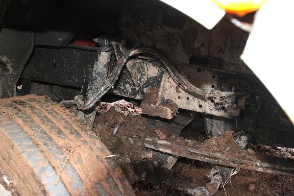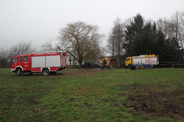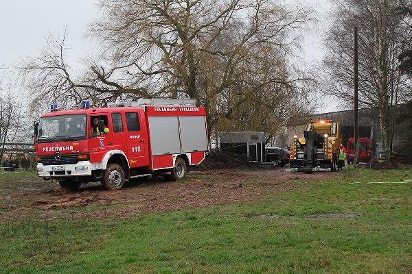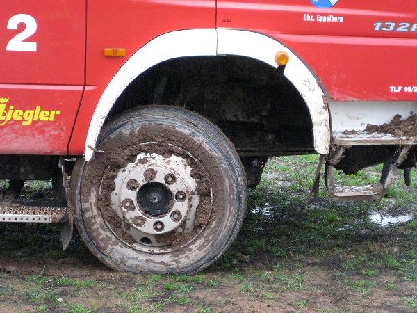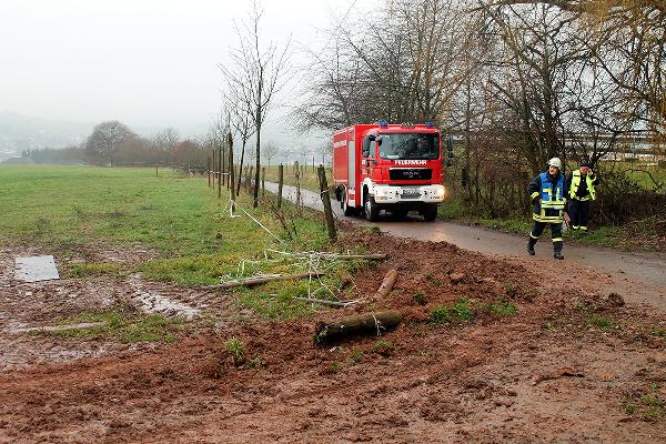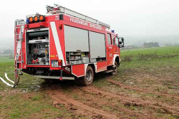 In Höhe des Berghofes musste der Fahrer des rund 14 Tonnen schweren Einsatzfahrzeugs Ästen ausweichen und kam dabei mit den Rädern auf den Seitenstreifen. Dort waren vor Kurzem erst die Leitungen zur neuen Windenergieanlage verlegt worden und man hatte es offenbar versäumt, das wiederverfüllte Erdreich fachgerecht zu verdichten. Deshalb sackte das Löschfahrzeug ein und geriet ausser Kontrolle. Der Fahrer reagierte richtig und versuchte, das Fahrzeug auf den angrenzenden Acker zu lenken. Er konnte damit verhinderten, dass das mit neun Einsatzkräften besetzte Einsatzfahrzeug umkippte.