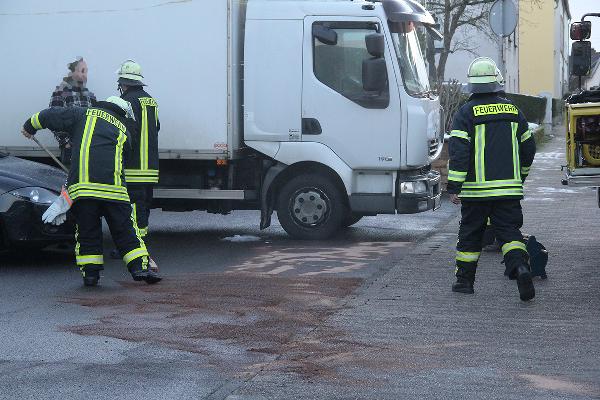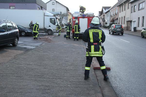 Zur Verhinderung einer erneuten Ausbreitung wurde der Bereich unter dem Lkw mit Bindemittel abgestreut. Der ebenfalls alarmierte Löschbezirk Hierscheid konnte die Anfahrt zu Einsatzstelle abbrechen.
