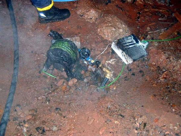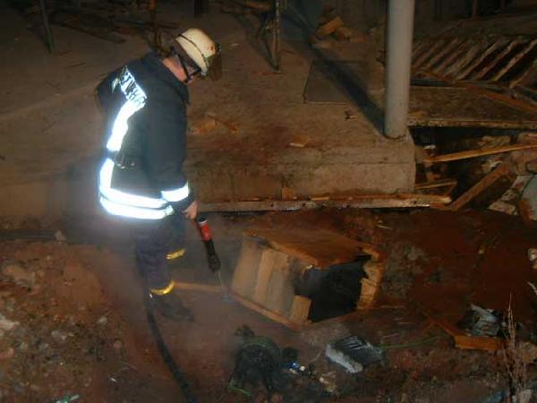 Direkt bei der Ankunft an der Einsatzstelle zeigte sich, dass es sich bei dem Brand glücklicherweise nicht um einen Wohnhausbrand handelte. Eine Holzkiste, mit der der Wasseranschluß der Baustelle abgedeckt war, stand in Flammen. Das Zischen, das Anwohner fälschlicherweise für Gasaustritt hielten, stellte sich als die durch die Hitze undicht gewordene Wasserleitung dar.