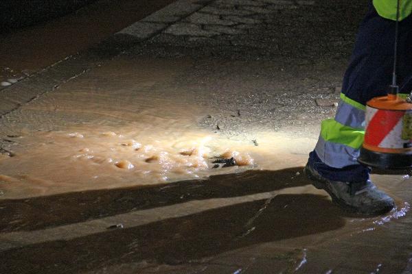 Während ein Mitarbeiter des ebenfalls alarmierten Wasserversorgers den Hausanschluss abdrehte, beseitigten die Männer und Frauen der Feuerwehr das eingedrungene Leitungswasser mit Schiebern und Wassersaugern. Noch an dieser Einsatzstelle erreichte sie eine weitere Einsatzmeldung: Nur wenige hundert Meter weiter quoll Wasser aus dem Bürgersteig vor einem Wohnhaus in der Landstuhlstraße.