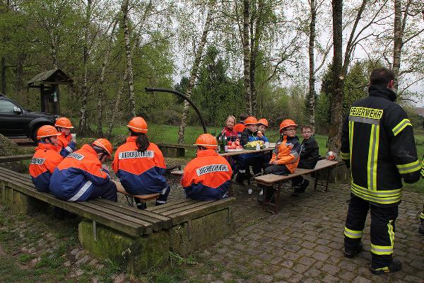 Ziel war das Feuerwehrgerätehaus in Eppelborn, wo alle Teilnehmer nach Abschluss der Aufgaben wieder zusammenkamen. Dort gab es zuerst einmal eine Stärkung nach den kräftezehrenden Aufgaben in Form von Currywurst.