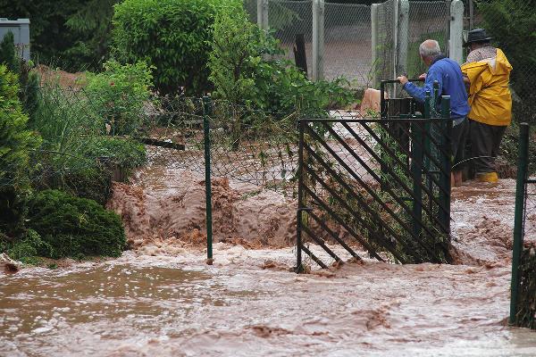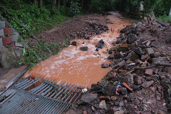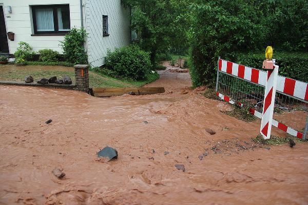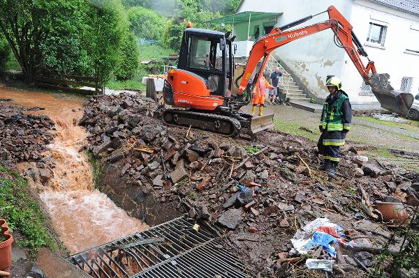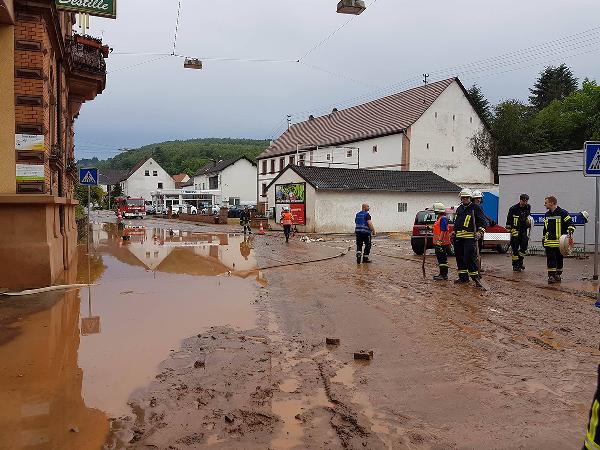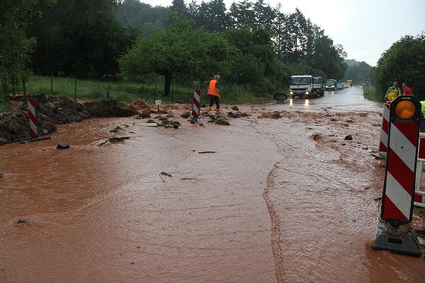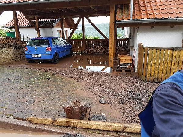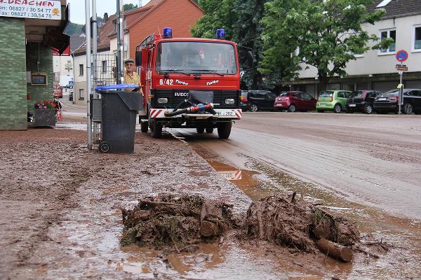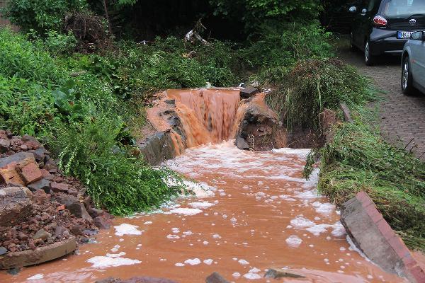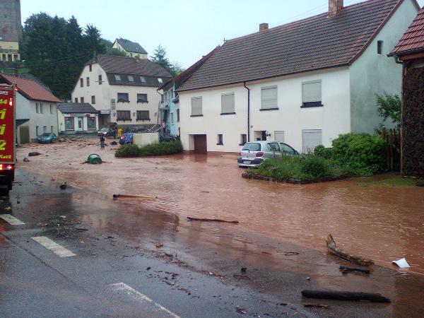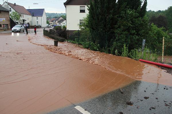 Dirmingen. Am Nachmittag des 07. Juni 2016 wurde der Eppelborner Ortsteil zum zweiten Mal innerhalb von nur vier Tagen von einem Unwetter heimgesucht. Gegen 15:45 Uhr zog eine Gewitterzelle über den Ort und brachte heftigen Starkregen mit. Innerhalb weniger Minuten ergossen sich wahre Sturzbäche von den Feldern und Wiesen über Straßen und Wege und überfluteten den gesamten Ort. Das Wasser spülte dabei große Mengen an Schlamm und Geröll mit, die die Regeneinlaufschächte verstopften und so die Situation noch verschärften. Nur wenig später wurde Alarm für alle acht Löschbezirke der Gemeinde Eppelborn ausgelöst.