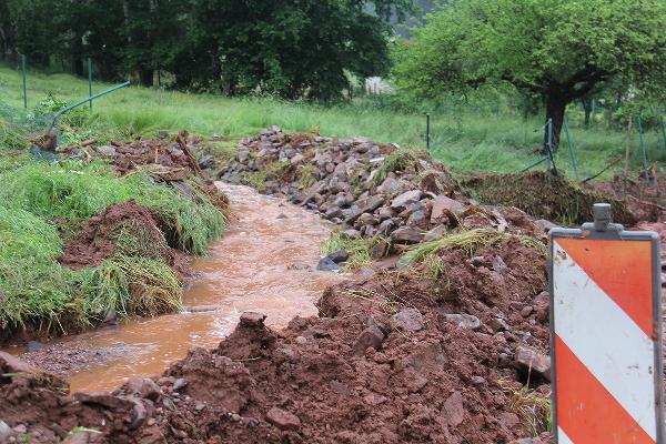 Aufgerissene Straßen, mitgerissene Wege, verwüstete Grundstücke, Gärten und in Mitleidenschaft gezogene Häuser: Auch am Tag nach der Katastrophe prägten die Folgen des Unwetters das Ortsbild von Dirmingen. Auch wenn sich das Wasser zurückgezogen hatte, gab es für die Helfer noch immer viel zu tun: Die Straßen mussten vom Schlamm befreit, Keller ausgepumpt und Schutt und Trümmer beseitigt werden. Die Ortsdurchfahrt Dirmingen blieb bis zum Nachmittag gesperrt. Da für den Nachmittag weitere Starkregenfälle gemeldet waren, wurden weitere Sandsäcke aus den umliegenden Gemeinden angefordert und an die Bürger ausgegeben.