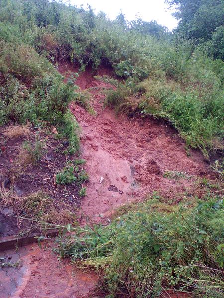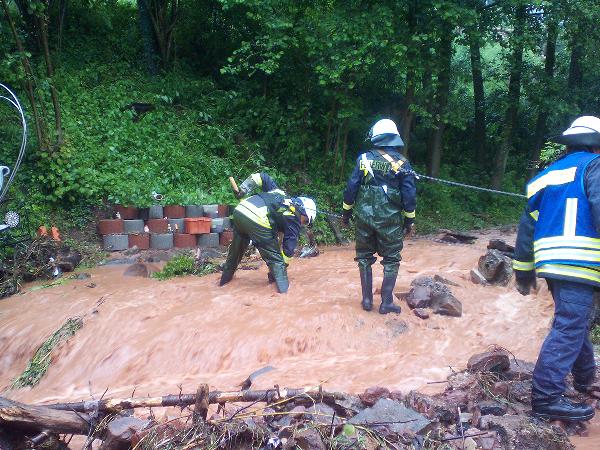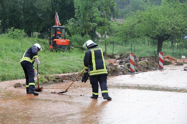 Während die Helfer aus Dirmingen zu den ersten Einsatzstellen ausrückten, mussten sich die Einsatzkräfte aus den übrigen Löschbezirken erst den Weg nach Dirmingen freikämpfen: Auf der L112 versperrte in Höhe des Friedhofs Geröll den Weg. Gemeinsam mit dem Gemeindebauhof musste hier zuerst einmal schweres Gerät eingesetzt werden, um freie Bahn für die Einsatzfahrzeuge zu schaffen.