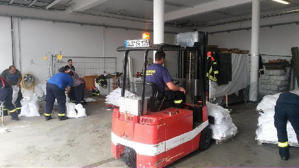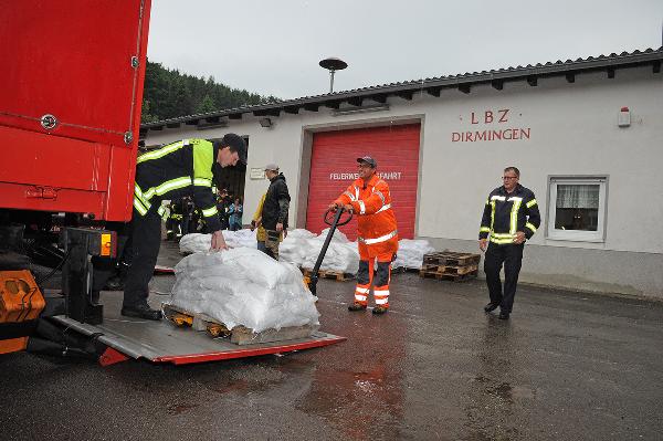 Ein Großteil der Säcke kamen von der Feuerwehr Schmelz, wo die Sandsackfüllanlage des Landkreises Saarlouis stationiert ist. Rund 30 Helfer aus Schmelz, Primsweiler, Michelbach und Dorf waren dort ab 09:45 Uhr damit beschäftigt, 30 Kubikmeter Sand in Sandsäcke zu füllen und mit den Gerätewägen Logistik aus Schmelz, Illingen und Uchtelfangen nach Dirmingen zu bringen. Bis um 16:00 Uhr waren die Helfer in Schmelz im Einsatz.