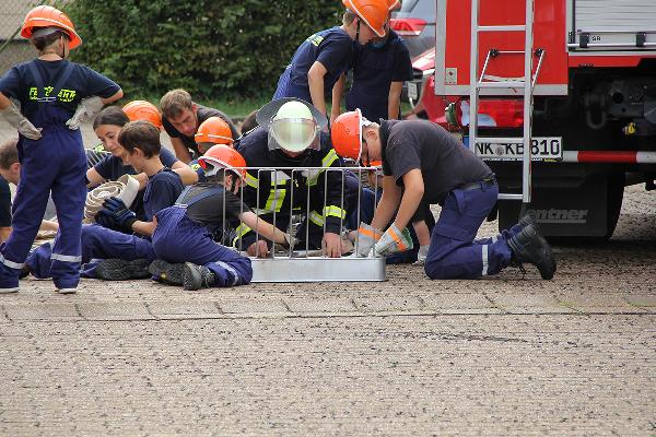 Auf dem Schulhof der Montessorischule hatten die Jugendlichen ebenfalls einen Brand zu bekämpfen. Ausserdem mussten dort zwei Propangasflaschen gekühlt werden. Und vor dem Schulgebäude galt es, eine Person unter einem Fahrzeug zu befreien. Bei dieser technischen Hilfeleistung musste das Fahrzeug mit Hölzern unterbaut und dann mit pneumatischen Hebekissen angehoben werden.
