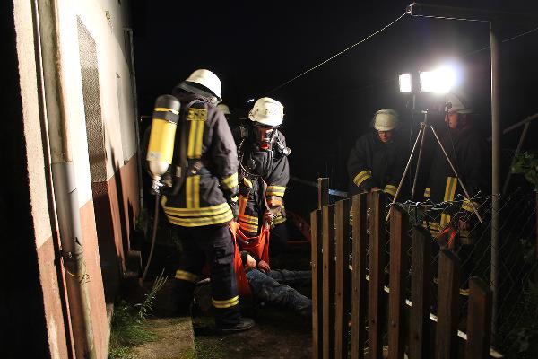 Aufgrund der Dunkelheit musste die Einsatzstelle ausgeleuchtet werden. Die beiden Brände im Keller und im Erdgeschoss konnten ebenfalls schnell gelöscht werden. Mit einem Überdrucklüfter konnte dann der Brandrauch, der in diesem Fall aus einer Nebelmaschine kam, aus den Räumen geblasen werden.