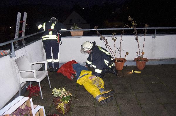 Parallel zu dem Brandeinsatz war der Löschbezirk auch bei einer Personenrettung aus dem Obergeschoss gefordert. Eine Person war durch die Aufregung gestürzt, und musste in Absprache mit dem Rettungsdienst schonend über Leitern ins Erdgeschoss gebracht werden. Auch dieses Übungsszenario wurde effektiv und erfolgreich abgearbeitet.