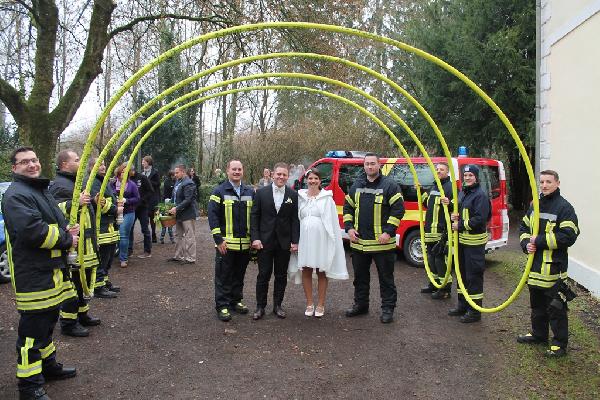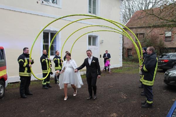 Mit einem Tunnel aus Schläuchen wurde das Brautpaar von den Kameraden und Kameradinnen empfangen und die besten Glückwünsche aller Mitglieder mit einem kleinen Präsent überbracht.