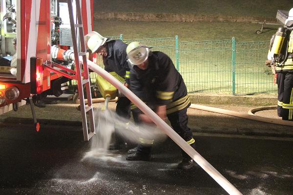 Probleme bereiteten die eisigen Temperaturen unter dem Gefrierpunkt: Löschwasser gefror sofort und verwandelte Fußwege und Straße in eine rutschige Fläche. Der Gemeindebauhof rückte mit Streusalz und einem Streufahrzeug an, um die Gefahr zu beseitigen.