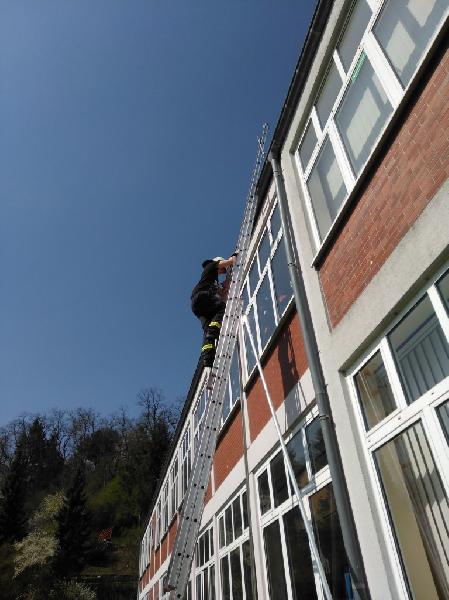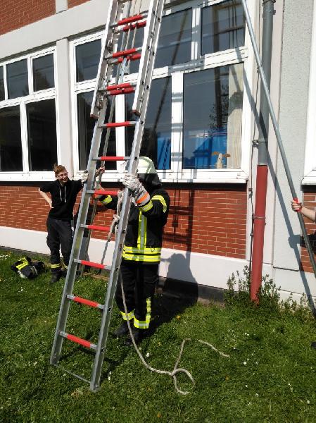 Pünktlich um 12 Uhr kam das Mittagessen an und es wurde eine Pause eingelegt. Frisch gestärkt wurde nach der Pause sogleich wieder mit Übungen rund um den Löscheinsatz mit Leitern begonnen. Ein Hightlight war dann aber nachmittags das in Stellung bringen und Begehen der dreiteiligen Schiebeleiter, die bis zu einer Arbeitshöhe von 12 Metern eingesetzt werden kann. Dabei lernten die Anwärter, dass es gar nicht so einfach ist diese Leiter zu handeln. Es konnte jeder mal testen bis zu welcher Höhe er es sich zutraut zu gehen. Es hat den Anwärtern Spaß gemacht. Die UVV (Unfallverhütungsvorschrift) wurde über den ganzen Tag hinweg angesprochen und die Teilnehmer wurden sensibilisiert, keine unnötigen und lebensgefährlichen Risiken einzugehen.