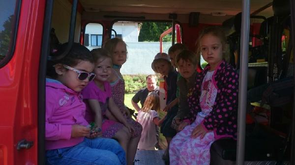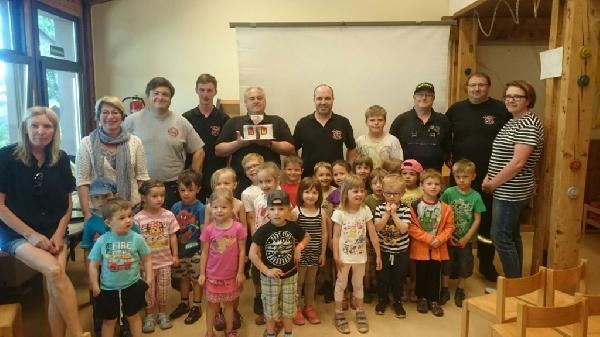 Im Anschluss zur Räumungsübung wurde den Kindern erklärt wie ein Atemschutzgerät funktioniert und was ein Feuerwehrmann alles zum Einsatz mitnehmen muss. Auch durften die Kinder mit einem D-Strahlrohr einen Löschangriff auf ein Haus ( Wand aus Holz) durchführen. Da alle Kinder das Feuer (Umfallende Klappen in der Holzwand) sehr schnell gelöscht hatten, wurden Sie von Löschbezirksführer Heino Molter mit einer Urkunde zum „Kinderlöschmeister“ befördert und bekamen eine kleine Haribo-Nascherei. Sie durften dann noch die Feuerwehrfahrzeuge unter die Lupe nehmen und sich auch mal rein setzen.