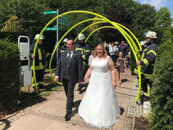 Mit einem Tunnel aus Schläuchen wurde das Brautpaar von den Kameraden und Kameradinnen empfangen und die besten Glückwünsche aller Mitglieder in Form eines kleinen Präsents überbracht. Jochen musste mit einem Rettungsknoten zeigen, dass er das Feuerwehrhandwerk beherrscht, Liane konnte ihr Geschick an der Kübelspritze unter Beweis stellen.