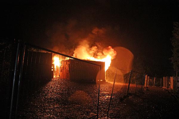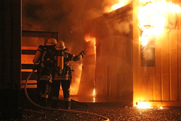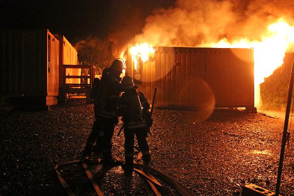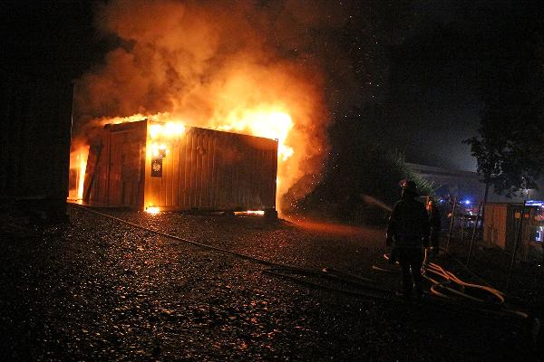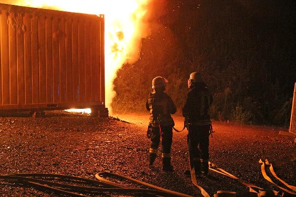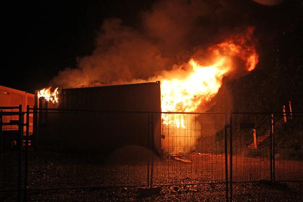 Eppelborn. Meterhoch schlugen in der Nacht zum 12. August 2017 bereits die Flammen aus einem Baucontainer, als Autofahrer den Brand auf der Baustelle an der Autobahnbrücke an der A1 in Höhe der Anschlussstelle Eppelborn bemerken. Sie informierten die Leitstelle über den Notruf 112, die daraufhin sofort Alarm für die Löschbezirke Eppelborn und Dirmingen auslöste.