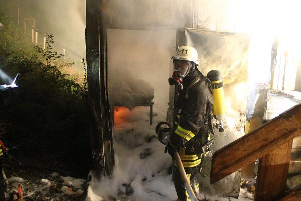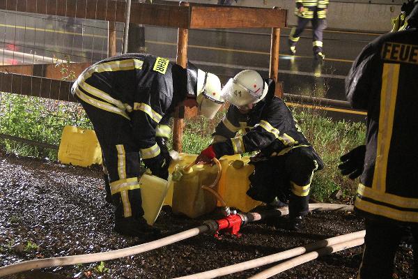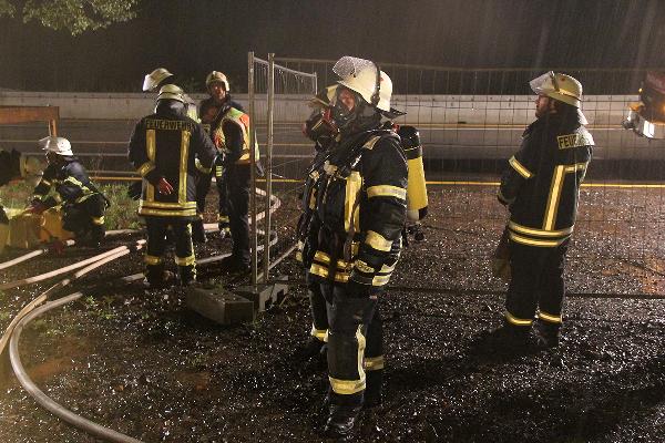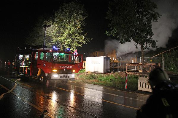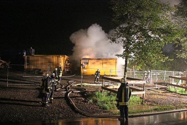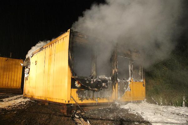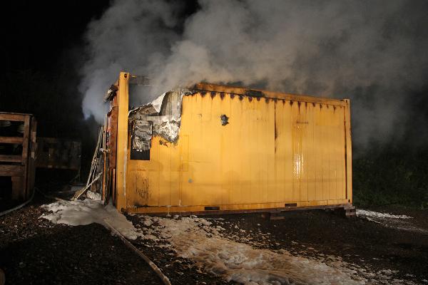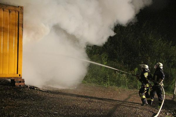 Beim Eintreffen der Einsatzkräfte stand der als Büro genutzte Baucontainer bereits im Vollbrand. Die sofort eingeleitete Brandbekämpfung erfolgte mit zwei Trupps zum Teil unter umluftunabhängigem Atemschutz mit je einem C-Rohr. Da an der Autobahnauffahrt keine Hydranten zur Verfügung standen, musste das benötigte Löschwasser durch Pendelverkehr zur Einsatzstelle gebracht werden.
