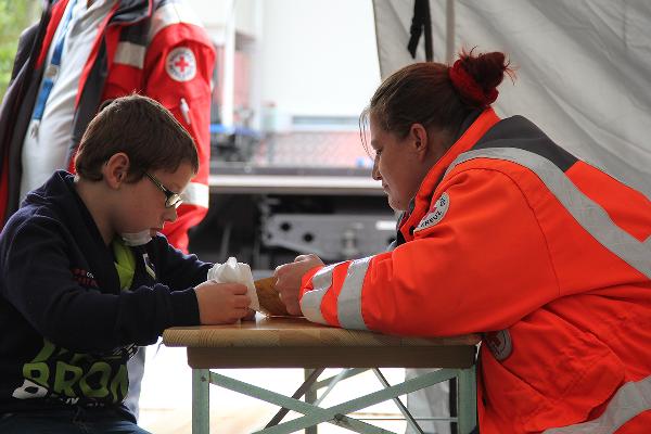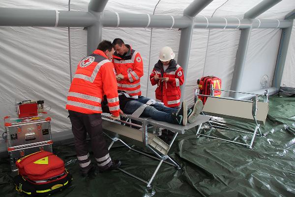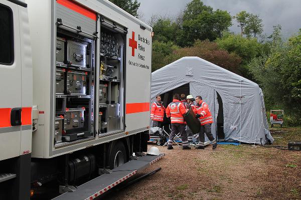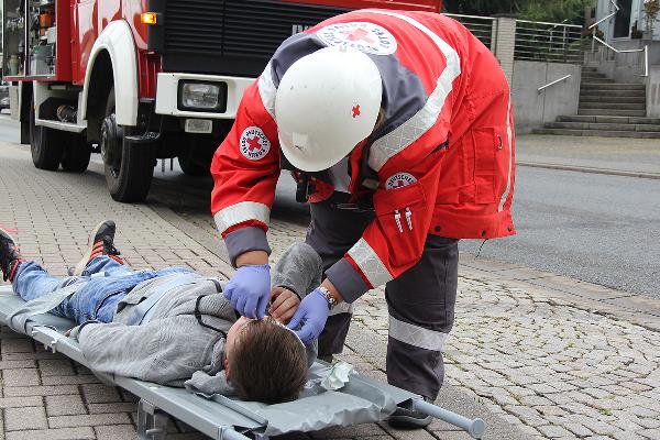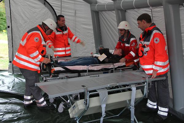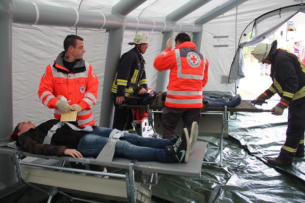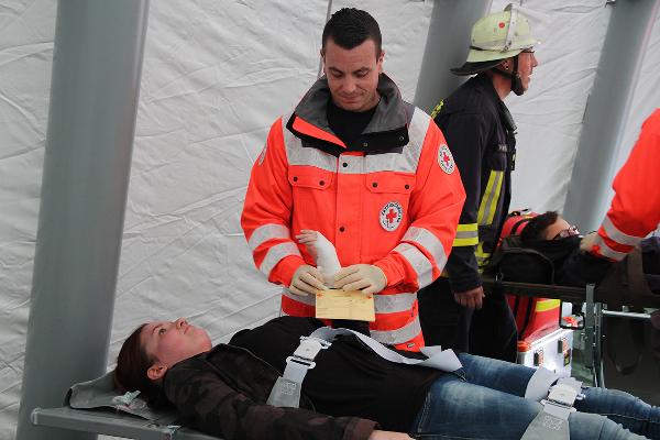 Parallel dazu bauten die 18 Helfer des Roten Kreuzes aus den Ortsvereinen Wiesbach und Ottweiler eine Verletztensammelstelle und einen Behandlungsplatz auf einem nahe gelegenen Parkplatz auf und bereiteten sich auf die Übernahme der Geretteten vor. Bereits in den ersten 20 Minuten mussten mehr als 5 Verletzte aufgenommen, registriert, gesichtet und versorgt werden.