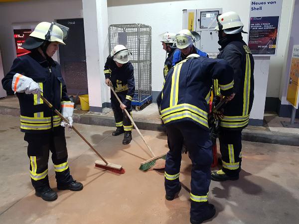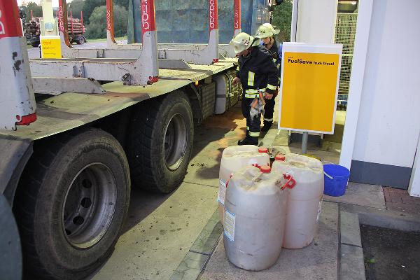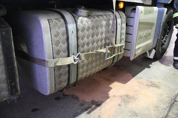 Noch vor dem Eintreffen der Einsatzkräfte aus dem Löschbezirk Bubach-Calmesweiler hatte der Fahrer mit einem untergestellten Eimer dafür gesorgt, dass der austretende Kraftstoff aufgefangen wird. Mit einem Spanngurt und einem Holzklotz sowie einem Stück Feuerwehrschlauch konnte die kleine Schadstelle notdürftig verschlossen werden. Dann konnte der Kraftstoff in dem Tank mit einer speziellen Dieselpumpe in bereitgestellte Fässer umgepumpt werden. Ein weiteres Austreten von Kraftstoff konnte durch diese Maßnahmen verhindert werden. Die Verkehrsfläche unter dem beschädigten Tank wurde mit Bindemitteln abgestreut.