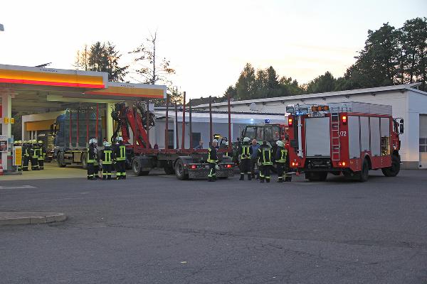 Die ebenfalls alarmierten Einheiten aus den Löschbezirken Eppelborn und Macherbach konnten den Einsatz noch auf der Anfahrt abbrechen. Der Rüstwagen Gefahrgut (RW-G) der Feuerwehr Neunkirchen war ebenfalls vor Ort, wurde jedoch auch nicht eingesetzt. Ursache für den Schaden war vermutlich ein hochgewirbelter oder in die Fahrbahn ragender Gegenstand auf einem Waldweg, wo der Holztransporter noch kurz zuvor im Einsatz war. Die Einsatzstelle konnte an die Polizei übergeben werden.