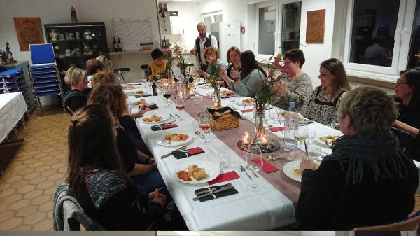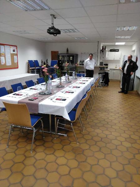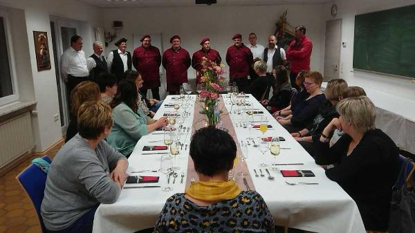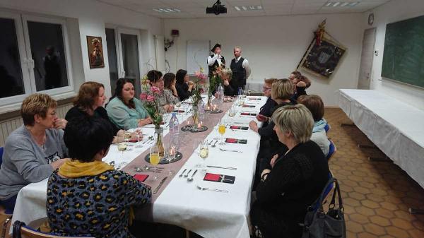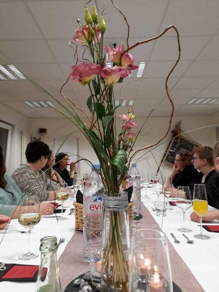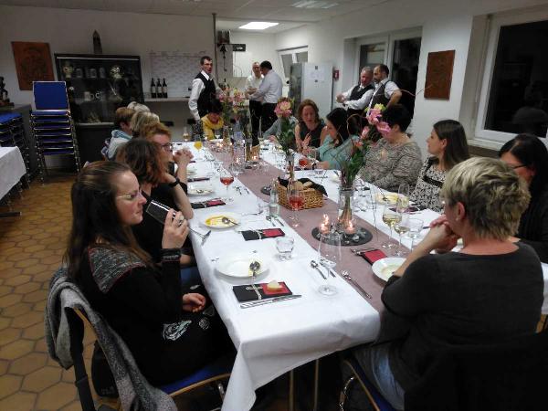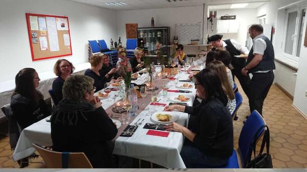 Nach dem Sektempfang fand Löschbezirksführer Markus Lambert Worte des Dankes für die anwesenden Frauen, die den Löschbezirk bei den verschiedensten Veranstaltungen tatkräftig unterstützen. Heino Molter, stellvertretender Löschbezirksführer und Küchenchef im Löschbezirk, der auch die Idee zu dem Dinner hatte, leitete souverän das Event. Die Tische im Schulungsraum waren geschmackvoll dekoriert und so begann der Auftakt des Abends mit einer leckeren Vorspeise mit Namen "Mümmelmann's Liebling" (Karottensuppe mit Ingwer). Es folgten, in Zeitabständen, noch weitere vier Gänge: