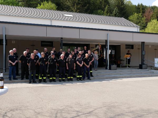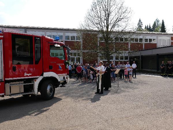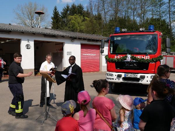 Pfarrer Schneider und Pfarrer Bokumabi nahmen die Einsegung vor und baten Gott darum, dass die Feuerwehrleute mit diesem Fahrzeug den in Not geratenen Menschen immer helfen können. Auch für eine gesunde Heimkehr nach den Einsätzen wurde gebetet.