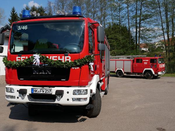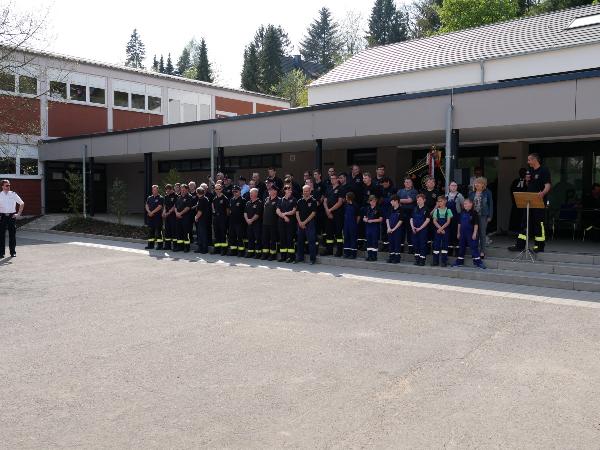 Alle warteten darauf, dass aus der Fahrzeughalle das neue HLF20 herausgefahren würde. Es war wohl für alle anwesenden Gäste und Bürger eine Überraschung, als aus der vernebelten Halle das alte Fahrzeug LF16 heraus kam. Dann hörte man aus der Ferne ein Sondersignal, dass immer näher kam. Auf den Hof fuhr das neue HLF20, besetzt mit den Kameraden/innen der Jugendfeuerwehr Dirmingen.
