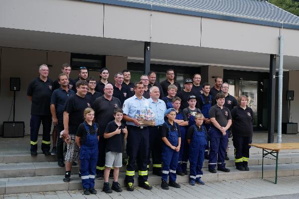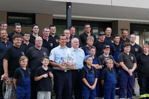 Fabian Schlicher, Vorsitzender des CDU-Ortsverband Dirmingen, überreichte ebenfalls noch eine Spende für die Jugendarbeit an Löschbezirksführer Markus Lambert. Markus Lambert dankte im Namen der Wehr. Im Anschluss an den offiziellen Teil wurde durch Steffen Pechtel, Feuerwehr Finsterwalde und Pierre Jungblut, Feuerwehr Pfaffenthal, das von Roland Köhl, Bitburger Brauerei, gesponserte Fass Bier angeschlagen und an die Besucher verteilt. Unterstützung leistete hier Kreisbrandinspekteur Werner Thom.