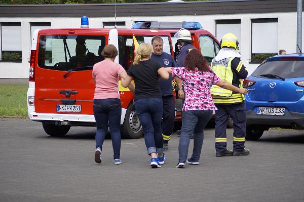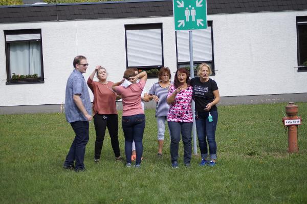 Vor dem Gebäude warteten bereits Helfer des DRK auf die Geretteten und übernahmen die weitere Versorgung. Während der Rettung stellten andere Einatzkräfte die Löschwasserversorgung aus Hydranten her und begannen mit dem Löschangriff auf den vermeintlichen Brand. Haustechniker, der brandschutztechnische Beauftragte des saarländischen Schwesternverbandes und die Heimleitung, die ebenfalls intensiv bei der Vorbereitung der Übung geholfen hatte, beobachteten interessiert die Übung.