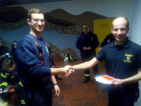 Bei der Abschlussbesprechung in Ottweiler, an der auch der Leiter der Kreisausbildung, Michael Sticher, sowie der kommissarische Wehrführer der Feuerwehr Eppelborn, Wolfgang Braun, anwesend waren, konnte der Lehrgangsleiter, Manuel Braun, den Teilnehmerinnen und Teilnehmern des diesjährigen Atemschutzgeräteträger Lehrganges für die erfolgreiche Teilnahme gratulieren. Den Teilnehmern aus der Feuerwehr Eppelborn wurden hierbei auch die Helmnummern, die „Atemschutzträger Punkte“ und ein Atemschutz Pass übergeben.