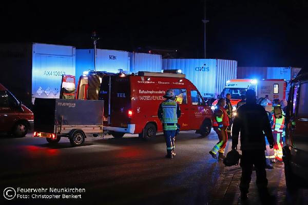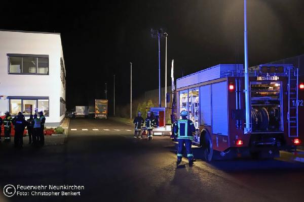 Eigentlich wollten die Speditionsmitarbeiter den mit Stückgut, darunter auch Chemikalien, beladenen Sattelauflieger am Montagnachmittag nur entladen. Doch als sie die Tür des Aufliegers öffneten, fiel ihnen direkt ein unüblicher, chemischer Geruch auf der aus dem Laderaum strömte. Als kurz darauf auch noch drei der Mitarbeiter über gesundheitliche Probleme klagten, löste die Spedition einen Notruf aus. Der dringende Verdacht bestand das ein Gefahrgut aus der Ladung des Aufliegers austrat und für Geruch und Gesundheitsprobleme verantwortlich war. Um 17 Uhr wurde deshalb von der Leitstelle nicht nur die Freiwillige Feuerwehr Neunkirchen alarmiert, sondern auch direkt der komplette Gefahrstoffzug des Landkreises in Marsch gesetzt. Die auf Chemieunfälle spezialisierten Feuerwehrleute sind mit ihrem Gerät über den ganzen Landkreis verteilt in den verschiedenen Kommunen stationiert und treffen erst an der Einsatzstelle zusammen. So machten sich kurz nachdem die Sirenen in der Neunkircher Innenstadt wieder verstummt waren 120 Feuerwehrangehörige mit 34 Einsatzfahrzeugen auf den Weg nach Sinnerthal.