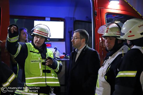 Geschützt mit Atemschutzgeräten und mit Messgeräten ausgerüstet gingen unterdessen Gefahrgutspezialisten zur Lageerkundung vor. Der Sattelauflieger und seine Ladung wurden von den Feuerwehrleuten aufs Genauste überprüft. Einen Ausschlag verzeichneten die Messgeräte jedoch nicht. Auch war der anfangs noch wahrnehmbare Geruch in der Luft wieder verflogen. Um einen Gefahrgutaustritt komplett ausschließen zu können, räumten Feuerwehrleute, auch wieder unter Atemschutz, die Ladung des Aufliegers um. Leckgeschlagene oder beschädigte Gebinde mit Gefahrgütern konnten aber auch sie nicht finden. Was für den Geruch und die Gesundheitsbeschwerden der Mitarbeiter verantwortlich war, konnte nicht geklärt werden, der Austritt von Gefahrgütern jedoch sicher durch die Feuerwehrspezialisten ausgeschlossen werden. Um sich über den Einsatzablauf zu informieren, kam auch Sören Meng - Landrat des Landkreises Neunkirchen an die Einsatzstelle. Sichtlich beeindruckt zeigte er sich von der Leistung der ehrenamtlichen Brandschützer in Stadt und Landkreis Neunkirchen.
