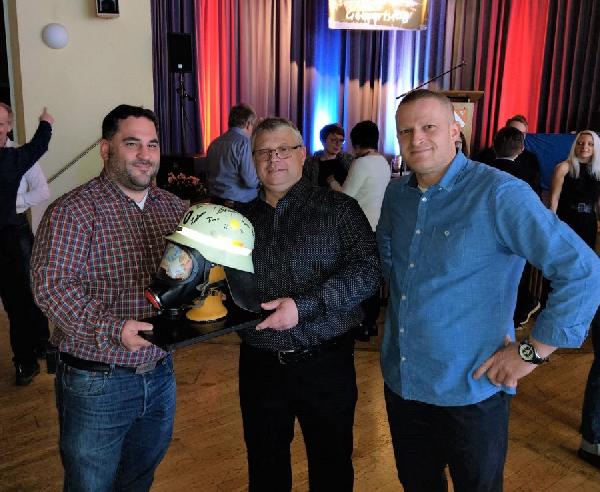 Löschbezirksführer Andreas Groß und sein Stellvertreter Frank Bonner konnten auch hierbei ein Geschenk der Kameradinnen und Kameraden des Löschbezirks Bubach-Calmesweiler überreichen. Aufgrund seiner Tätigkeit im Bereich Atemschutz, handelte es sich bei dem Geschenk um ein Model einer Atemschutzmaske mit Helm, gefüllt mit etwas "barem".