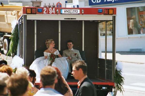 Krönender Abschluß war dann eine Fahrt mit der Drehleiter der Kameraden aus Lebach in luftige Höhen. Dann endlich konnten sie in ihrem prächtig geschmückten Feuerwehrfahrzeug die Fahrt zum Festsaal antreten.