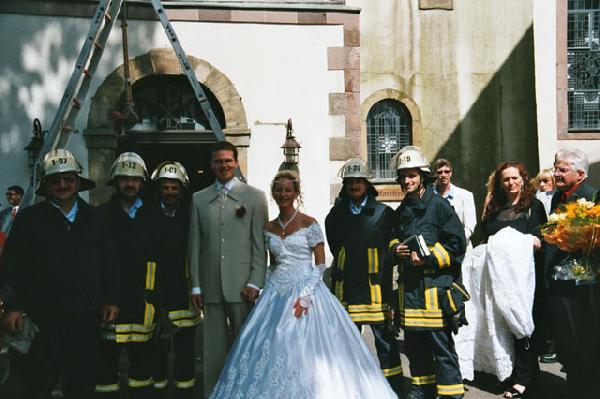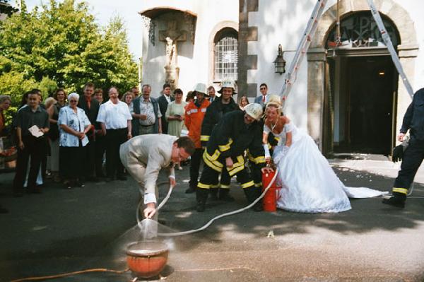 Als sie nach der Zeremonie die Kirche verließen, mussten beide erstmal ihre Ehetauglichkeit unter Beweis stellen, in dem sie das Band der Ehe ganz in Feuerwehrmanier mit Knoten und Stichen knüpften.