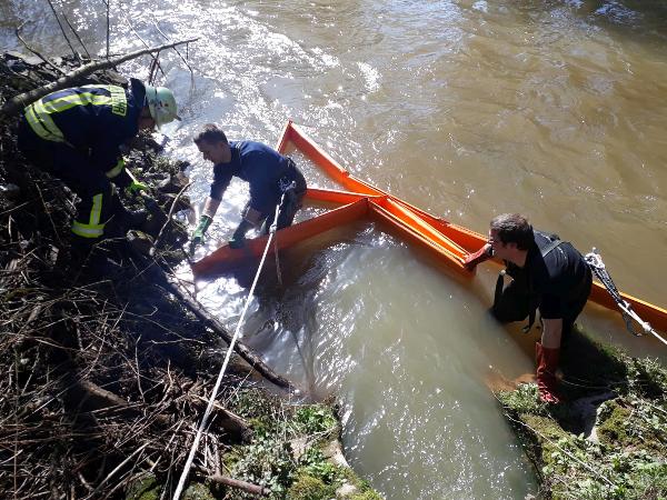 Obwohl in der Kläranlage in Bubach-Calmesweiler alle Vorbereitungen getroffen wurden, waren die ankommenden Mengen an verschmutztem Wasser zu groß. Deshalb wurde gegen 13:17 Uhr der Löschbezirk Bubach-Calmesweiler zur Unterstützung alarmiert. Mit einer Ölsperre verhinderten die EInsatzkräfte, dass sich Wasser-Diesel-Gemisch aus dem Überlauf des Beckens in der angrenzenden Theel ausbreiten konnte.