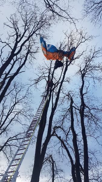 Bei Eintreffen an der Einsatzstelle wurde festgestellt, dass ein Paraglider in ca. 16m Höhe in einer Baumkrone festhing. Schnell stand fest, dass die beengte Zufahrt sowie fehlende Aufstellflächen den Einsatz einer Drehleiter unmöglich machten, weswegen der Löschbezirk Mettlach den Einsatz abbrechen konnte.