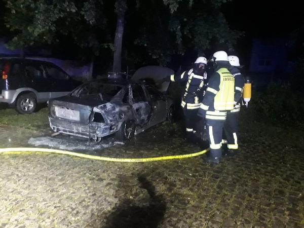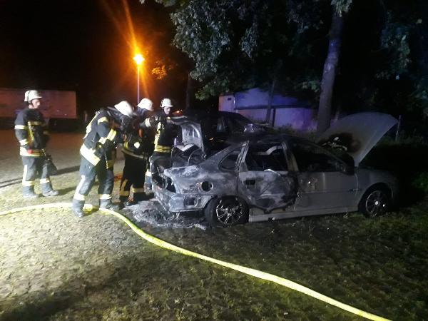 Der Wagen brannte komplett aus, auch ein daneben abgestellter Wagen wurde durch die Hitzeeinwirkung in Mitleidenschaft gezogen.