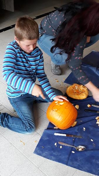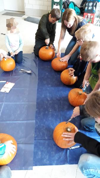 Gemeinsam mit ihrer Betreuerin Nadine Wagner stellten sie schaurig gruselige Leuchtfiguren aus großen orangenen Kürbissen her.