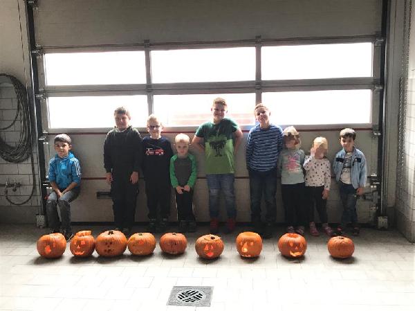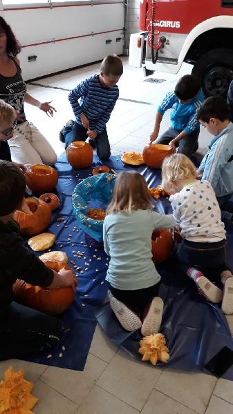 Mitten in der Fahrzeughalle wurde die Werkstätte eingerichtet und zuerst die Gesichter auf die Kürbisse aufgemalt, anschließend ausgehöhlt und danach noch die Gesichter sorgfältig ausgestochen.