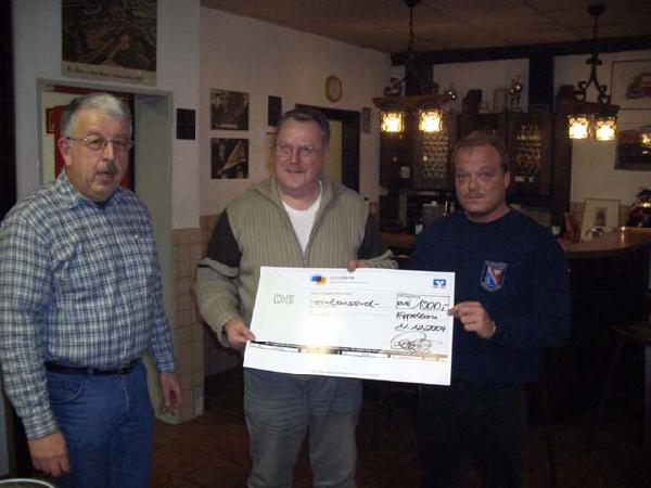 Als gerngesehene Gäste konnte Becker auch den Ehrenlöschbezirksführer Hans-Jürgen Olliger sowie den Eppelborner Heilpraktiker Josef Georg begrüßen. Beide waren der Einladung auch in diesem Jahr gerne wieder gefolgt. Josef Georg engagiert sich sehr für Kinder-Hilfsprojekte im Saarland, und wie auch in den Jahren zuvor wurde wieder eine Sammlung bei den Anwesenden durchgeführt. Nach dem Zählen stand fest: Zusammen mit den Einnahmen aus dem Getränkeverkauf eines Benefizkonzertes konnte eine Rekordsumme von 1000 Euro an Josef Georg übergeben werden. Aufgestockt wurde diese Summe dann spontan noch einmal um 100 Euro vom Fanfarenzug Eppelborn.