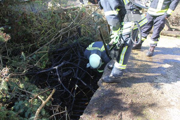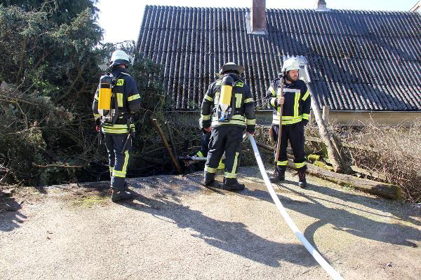 Die Einsatzkräfte aus dem Löschbezirk Dirmingen konnten den Schwelbrand mit einem Rohr schnell löschen. Ein weitere Ausbreiten und Übergreifen des Brandes auf ein dicht stehendes Wohnhaus konnte verhindert werden.