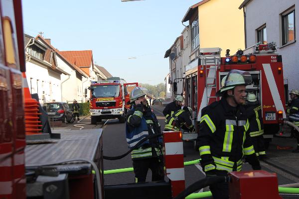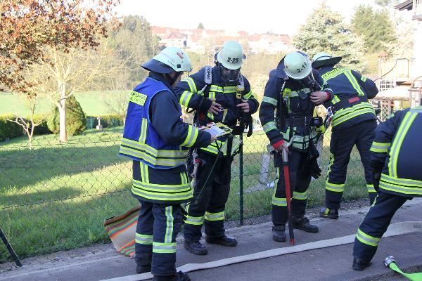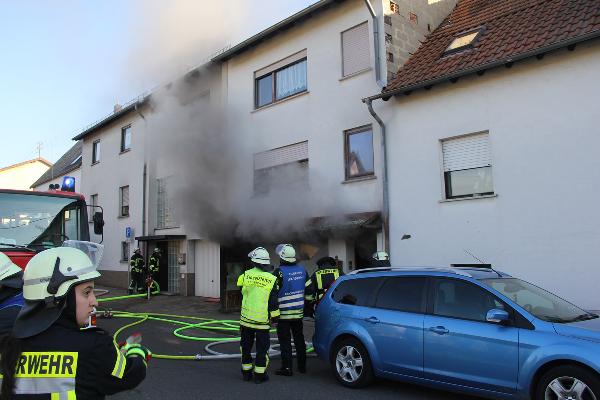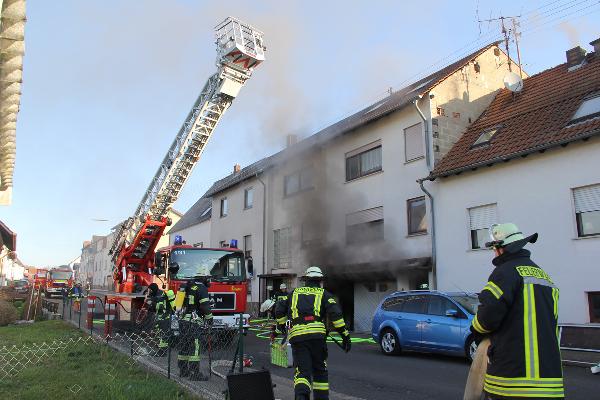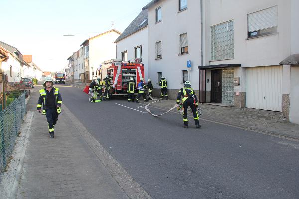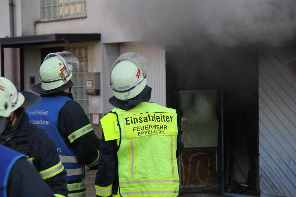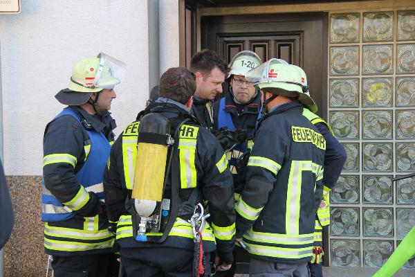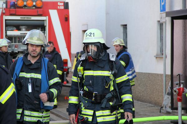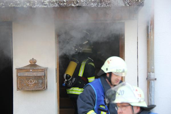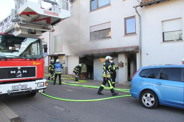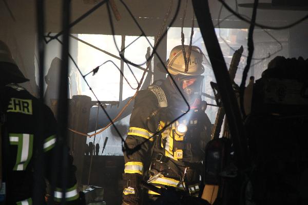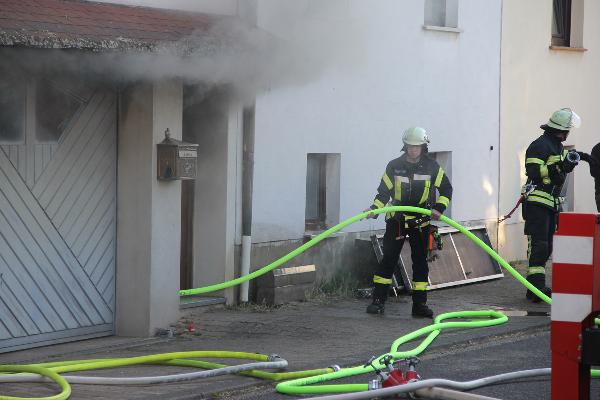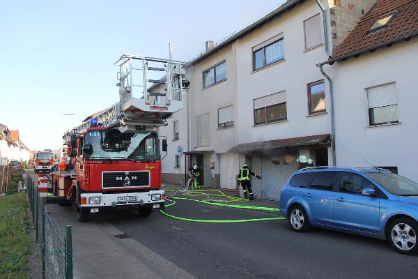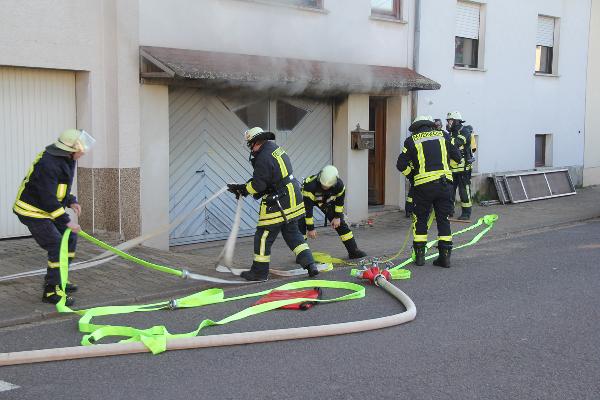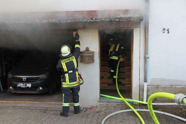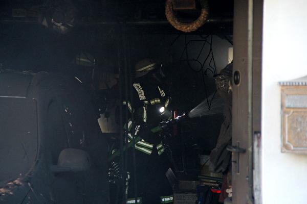 Beim Eintreffen der ersten Einsatzkräfte drang dichter Rauch aus der Garage im Erdgeschoss des Anwesens. Alle Bewohner hatten sich bereits in Sicherheit bringen können. Unter Atemschutz drang ein Trupp in die völlig verqualmte Garage vor und konnte den Brandherd im hinteren Bereich der auch als Lager genutzten Räumlichkeiten lokalisieren.