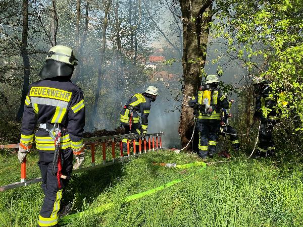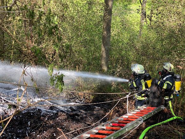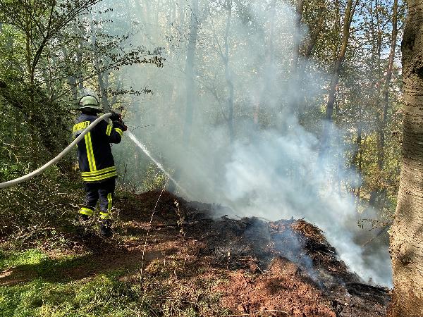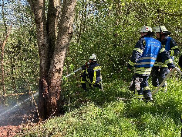 Sofort wurde der Brand unter Vornahme einer Löschangriffsleitung eingedämmt und die offenen Flammen abgelöscht, sodass sich das Feuer nicht weiter in das Waldstück ausbreiten konnte.